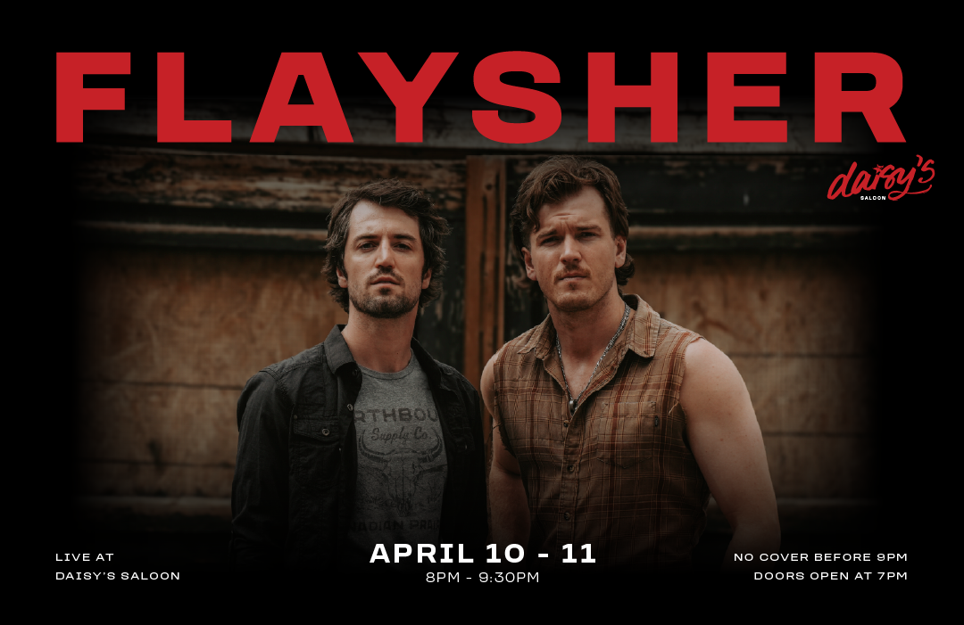 Join us April 10 & 11 at Daisy’s Saloon for live music with Flaysher from 8:00pm - 9:30pm. Doors open at 7:00pm. No cover before 9:00pm.